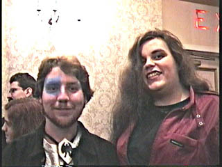 This photo was taken in 1998 at an event called The Gathering for fans of the cult Disney cartoon Gargoyles. This whole thing in this pic was a costume event. The person on the left is me with facial hair (not a good look, according to my mother, but I liked it). On the right is a fellow by the name of Eric Tribou (don't let the makeup fool you; he's in drag for a purpose), webmaster for Station 8, which is his own personal site as well as a site for Gargoyles fans. He's all right.