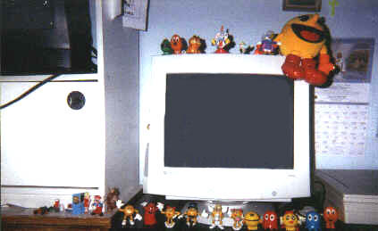 This is where I do all my PC work (the Internet, the Photoshopping, the webpage creation, MAME). Note all the video game and cartoon associated "doodads" around my computer desk. This best defines the personality of my PC workstation. You'll also notice that I Photoshopped that nasty reflection out of the monitor screen, so if it looks fake to you, then I apologize.