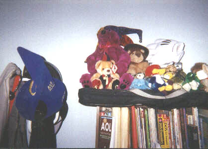 This corner of my room is dedicated to all the stuffed animals (and decorative accessories) I've acquired, mostly by plunking down lots and lots of money on crooked carnival games, and living within subway distance of Coney Island makes it pretty easy for much hard-earned cash to be swindled away in these games of chance. The only things that were legitimately purchased were the Mickey gloves, Sorccerer Mickey hat, and lightsaber, and those latter items will come in handy in another photo.