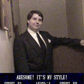 Okay, this is me in a semi-serious mood. I always liked the way I look in a suit, so I had several pics of me in a suit sent to a "rate how you look" site. I think I scored like a 6.4 or 6.7. Not too bad for an unemployed computer nerd with anger management problems. (BTW, the below caption is a quote from the game Samauri Shodown: Amakusa's Revenge. The quote belongs to the character Hamomaru. Somehow, with that pic, it just fit.)