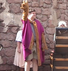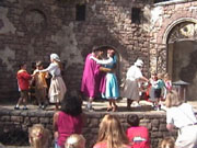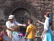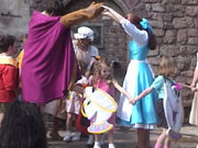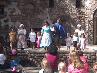 Now Papa had set out on a long journey to take one of his inventions to the fair, however along the way he became lost on a dark and scary road, and on this road there were wolves chasing after him. He was so frightened that he fell right off his horse, but he found shelter in what he thought was an abandoned castle, only it wasn't really abandoned at all. In fact, Papa made lots of new friends.
